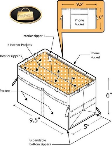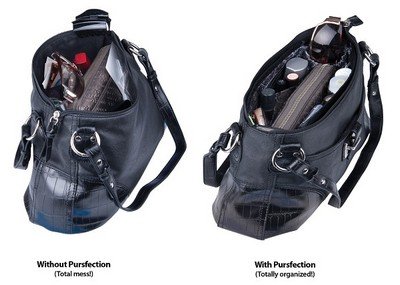Product Description The luxurious Pursfection organizer makes switching from one purse to another a breeze - just take it out of one handbag and slip it into another. Changing purses has never been simpler or faster, and you won't forget a thing - no more leaving your cell phone or lipstick behind! The pursefection handbag organizer has an expandable bottom. If you're going from a narrow bag to a wider bag, simply unzip one or both sides of the Pursfection purse organizer to make it wider. 9 compartments help to organize the entire contents of your bag, and we all know that an organized purse helps you feel less frazzled as you go through your day. The large open space in the center is the place for your wallet or make-up case, 5 smaller compartments organize your keys, brush or comb, mp3 player, tissues, hand sanitizer, etc. and 2 large zipped pockets are the place to store your loose change, valuables, and private items. The silky Pursefection purse handbag organizer insert also has 2 larger pockets on the outside and a phone pocket. Slouchy handbags are no problem for the Pursfection organizer - its firm sides will help any bag stand up nice and straight. It will give your tote or handbag great structure. This is the most elegant, handbag organizer we carry - it's both stylish and functional. ***Any purses or contents pictured are for informational purposes only and are not included. 0