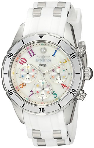 Invicta 24903 Angel chronograph women's watch features a 40mm wide and 12mm thick solid stainless steel case with silver tone aluminum accented fixed bezel and textured push-pull crown with function pushers. Invicta 24903 is powered by Japanese TMI VD54 quartz chronograph movement. This beautiful watch also features a white oyster dial with white accents silver tone luminous hands and Arabic numeral hour markers along with the chronograph and 12/24-hour time display functions, scratch resistant flame fusion crystal and water resistant to 100 meters. Invicta 24903 is equipped with a 20mm wide solid stainless steel and white silicone rubber strap with a buckle clasp. Invicta 24903 women's Angel chronograph white oyster dial steel & silicone strap watch is brand new and comes in an original Invicta gift box and is backed by a 5 year limited warranty.Feature