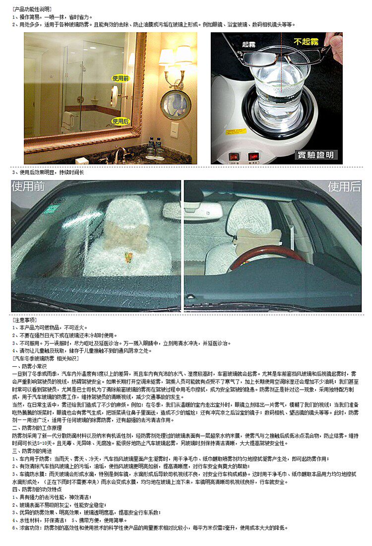 This product uses advanced technology developed, can thoroughly remove dirt surface of the glass, while the surface of the glass to form a layer of transparent film, with good, long-lasting anti-fog function. Foamy strong detergency way to clean, easy to use, spray a glass surface with a cloth wipe, make the glass clean bright as new. In damp, large temperature difference between inside and outside of the season, you can unlock your windshield fogging and blocking the line of sight because of the troubles, reduce traffic accidents.