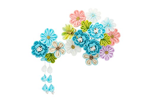 -. Title : 髪飾り つまみ細工 2点セット 水色 ライトブルー 桜 菊 花 蝶 フェイクパール ぶら飾り コーム 髪留め 成人式向け 卒業式向け 振袖向け 袴向け ヘアアクセサリー
