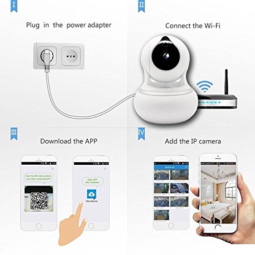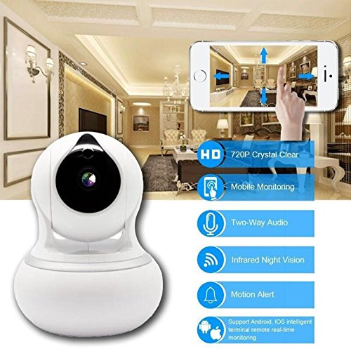 -. Feature : 720P HD: Really CRISP Daytime and Night Vision Image Quality. No Video Freezes or other flopover even by fast Pan and Tilt, and still keep in good image quality the same time. The distance of Night Vision is up to 6 meters. Providing remotely switch camera resolution in case you are under the unstable network to make sure smoothly video at anywhere anytime. / PLUG & PLAY SET UP: Guided, Intuitive App and Instructions will be worked out by Customer focused, and will rescue you from the long time reading instructions. Beginning to your seamlessly stream video and playback recorded video of your home, your kids, your pets, or your business on the Home Security Camera. / TWO WAY AUDIO and PAN/TILT/ZOOM: Built in Microphone and speaker like a video chat when you are listening and talking to your family. Remotely Control Pan 350 and tilt 100 to see almost every corner. Unbelievable wider angle of view than a general camera. / SMART TECHNOLOGY: Motion detection and intelligent alerts can provide real-time push notifications with captured images (Rich Media Message Push) by smart phone when you left. This wireless security camera offers totally convenience by remote access and control. / SUPERB COMPATIBILITY: Support Phone terminal: Andriod/Iphone. PC Platform: Mac/Windows PC/Linux. Web Browser: Safari/IE/Firefox/Chrome/Google.