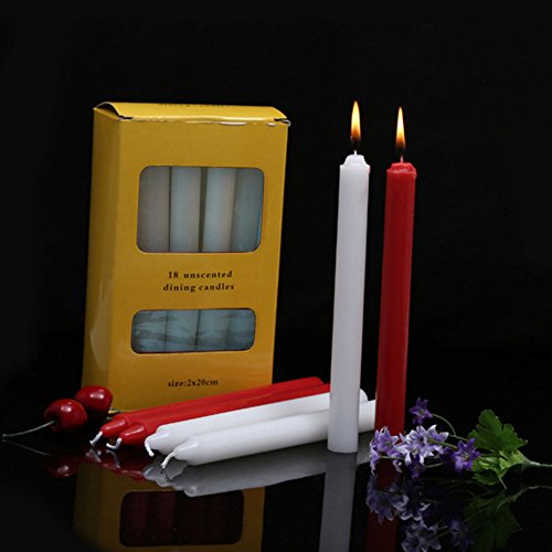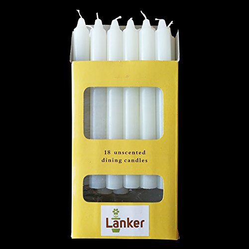 Studio : LANKER Publisher : LANKER Binding : Kitchen Product Description These 18 Pack white 8inch smokeless unscented dripless taper candles are perfect decoration for Weddings, Churches , Restaurants, Holidays, Party, Home Decor, Dating, Christmas, Halloween, Thanksgiving and Festival Celebration. Made of 100% Paraffin Wax, 100% Cotton Wick and they are Eco friendly and Non-toxic. Each candle will burn for about 6.5 hours. Ideal gifts for your family and friends.