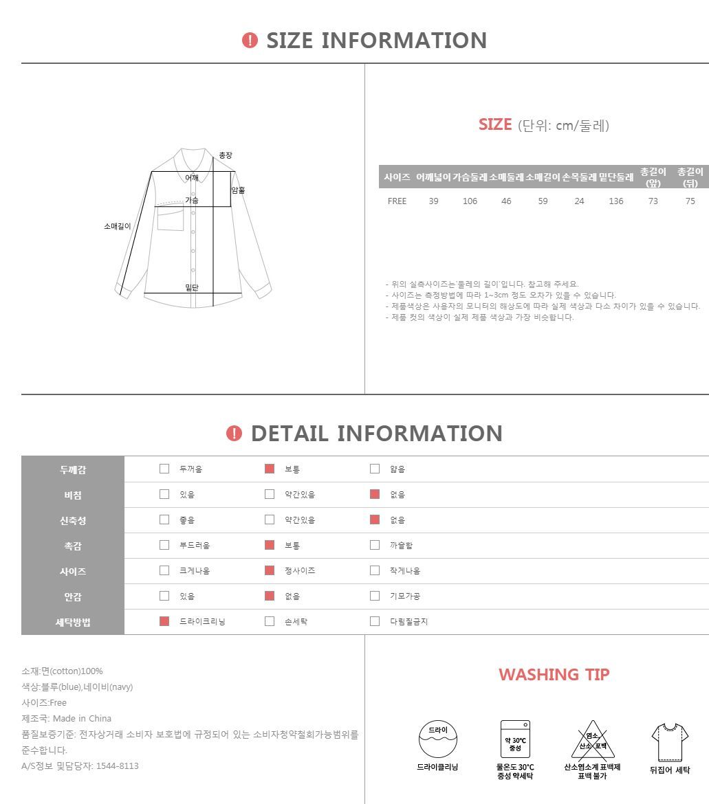 르니엔 체크배색 남방 #44076 심플한듯 캐주얼한 무드를 느낄 수 있는 르니엔 체크배색 남방 소개할께요 전체적으로 네추럴한 무드에 뒷면 체크배색이 화사한 포인트가 되어 한층 더 캐주얼한 무드로 즐기기 좋아요 소매에는 롤업디테일이 있어 롤업으로 연출하여 조금 더 활동적이고 시원하게 즐기기 좋으면서 양사이드에 히든포켓 디테일로 실용성도 높여줬어요 밑단 양사이드에 슬릿이 들어가면서 뒷면으로 체크배색이 자리잡아 밋밋하지 않고 세련되게! 단정한 카라네크라인 아래로 한켠에 포켓이 자리잡아 밋밋하지 않고 클래식함을 더해주는 아이템! 가리는 하의없이 어디에나 잘 어울려 이지스타일링을 도와드리는 아이템이에요. 추천드려요^^ COLOR,SIZE TIP 컬러는 네이비,블루으로 구성되어 있으며, 모델의 착용 컬러는 네이비 입니다. 사이즈는 FREE(44-66)사이즈로 진행되오니 고객님의 체형에 맞게 선택하셔서 예쁘게 착용하시길 바랍니다.