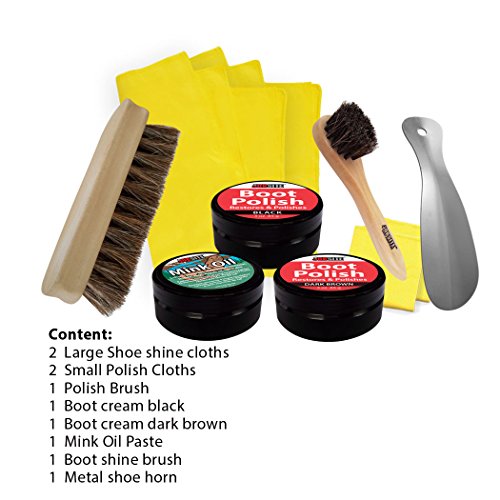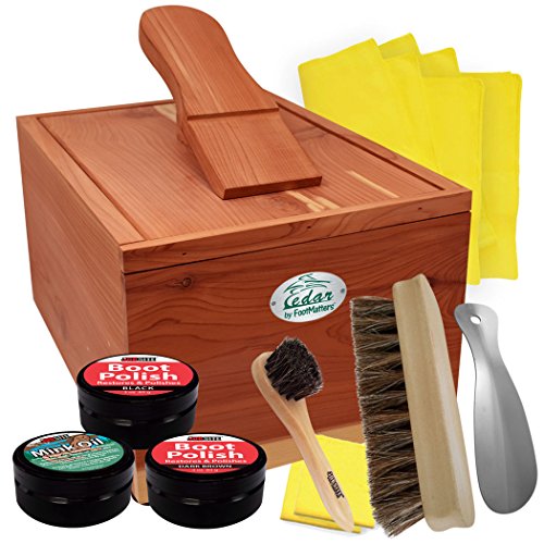 Product Description What Are FootMatters Red Cedar Boot Shoe Care Shine Box Kits? FootMatters Red Cedar Boot Shoe Care Shine Box Kit is your all in one solution for the shoe care products necessary for maintaining the polish and taking care of your shoes and boots. Our polish kits come in 3 varieties; Polish Kit, All Weather Kit, and Premium Polish Kit. We also offer our red cedar boot shoe care shine box as a standalone product. What Are The Benefits Of Using FootMatters Polish Kit? - Trusted JobSite polish restores the brilliant shine of your shoes and boots. - FootMatters Shoe Care Shine Box Kit comes with the essentials needed to care for your quality shoes and boots. - Shine Kit is the fantastic solution for cleaning, polishing, caring for your shoes and storing all your products neatly for the next use. FootMatters Polish Kit Contents. - Red Cedar Wood Shoe Shine Box; dimensions 12 x 9 x 7 inches ; 1 Magic Shine Black; 1 Magic Shine Brown; 1 Magic Shine Neutral; 1 Sweet Feet deodorant spray; 1 Leather Lotion; 1 Mink Oil Paste; 2 Shine Cloths. FootMatters Manufacturer Guarantee! 100% Money back - Satisfaction Guaranteed! Scroll back to the top now and click ADD TO CART to find the convenience you've been looking for! 0