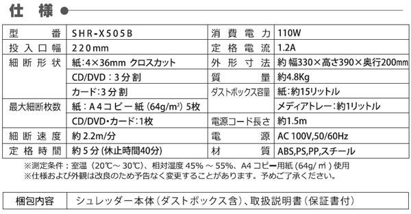 ゴミ捨て時に便利な持ち上げハンドル付き。A4サイズコピー用紙なら1度に5枚まで細断可能です。作動音は約60dB(空転時、本体正面から1mの距離にて測定)の静音タイプです。 |