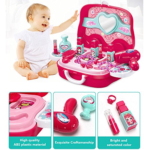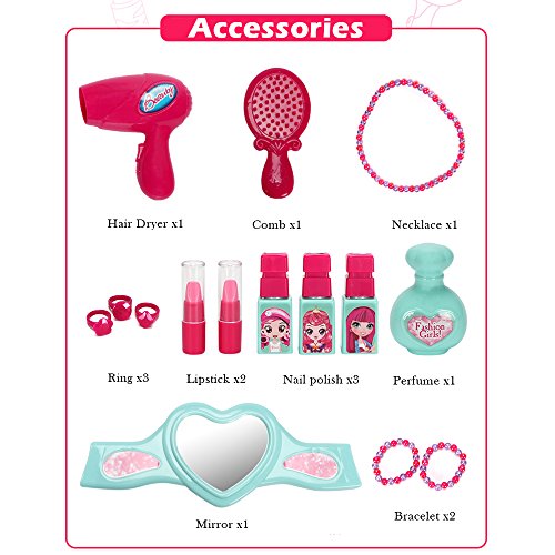 ✔16 PIECES MAKEUP TOY SET - Learning the difference of perfume, lipstick nail polish,you can sit before the mirror and let the baby help you creative a nice hairstyle with the hair dryer.Necklace,rings and bracelets are also essential accessories for girls.Increase their aesthetic ability and self-confidence.