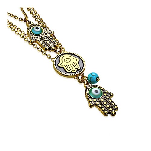 -. Title : Gold Color Plated 4 Color Evil Eyes Hand of Fatima/ Hamsa Charm Chain Necklace & Pair of Stud Earrings with Turquoise Bead (SET)