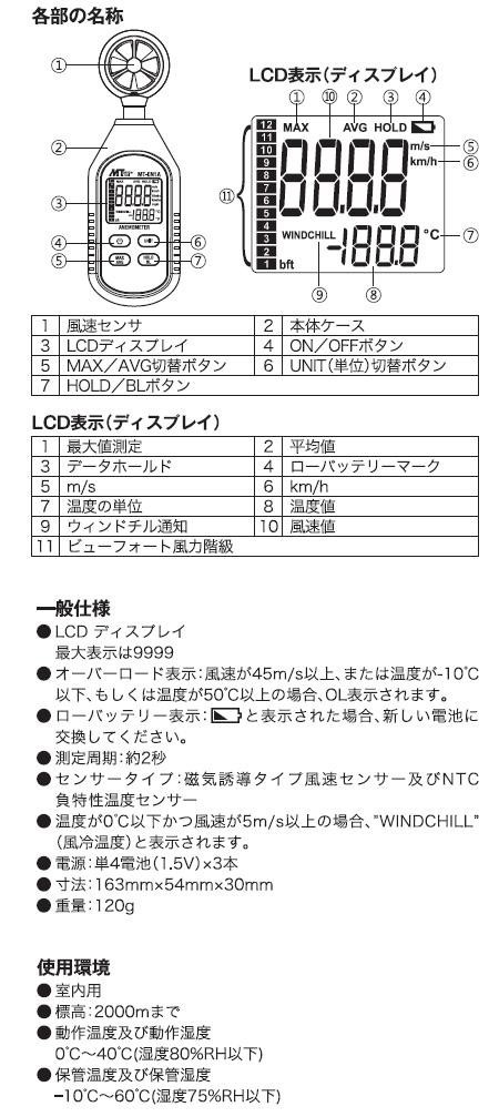 簡単な操作で測定できる小型風速計です。 製造国:中国 商品サイズ:W54×H163×D30mm 重量:約120g(電池含む) 仕様:電源:単4電池×3 付属品:テスト用電池(本器に内蔵)取扱説明書兼保証書(保証期間1年) ※サプライヤー直送品 ご注文後3~4営業日後の出荷となります【商品名】マザーツール デジタル風速計 MT-EN1A