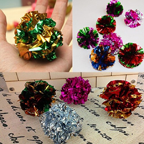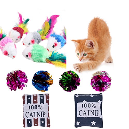 -. Feature : Comes with 11 Pack kitty toys including 5 Mice, 4 Crinkle Balls and 2 Catnip Pillows; Note: all in this set, the colors of every item will be sent at random, you may receive repeated or different colors, thanks for your understanding / 5 random color Mice with Colorful Feather tails; there are some small plastic balls inside in the mouse body, a slight rustle sound given by it when shaking or moving it, just like a real mouse rustling sound as they move / 4 random Crinkle Balls--You kitten will go crazy with the cat ball toy that makes crinkle sound when playing / 2 random catnip pillows, Containes 100% Organic Catnip Inside pillow; your cats will enjoy rolling about on the floor with these / Funny interactive cat toys or cat exercise toy; keep your cats busy, won't feel lonely when you go out