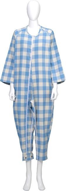 胸元にホックのないスマートなデザイン。右足首から胸元のファスナーと、股部分のファスナーで、着替えや介護が楽にできます。前身ごろ、股下がめくれます。 製造国:フィリピン 素材・材質:綿68%・ポリエステル32%
