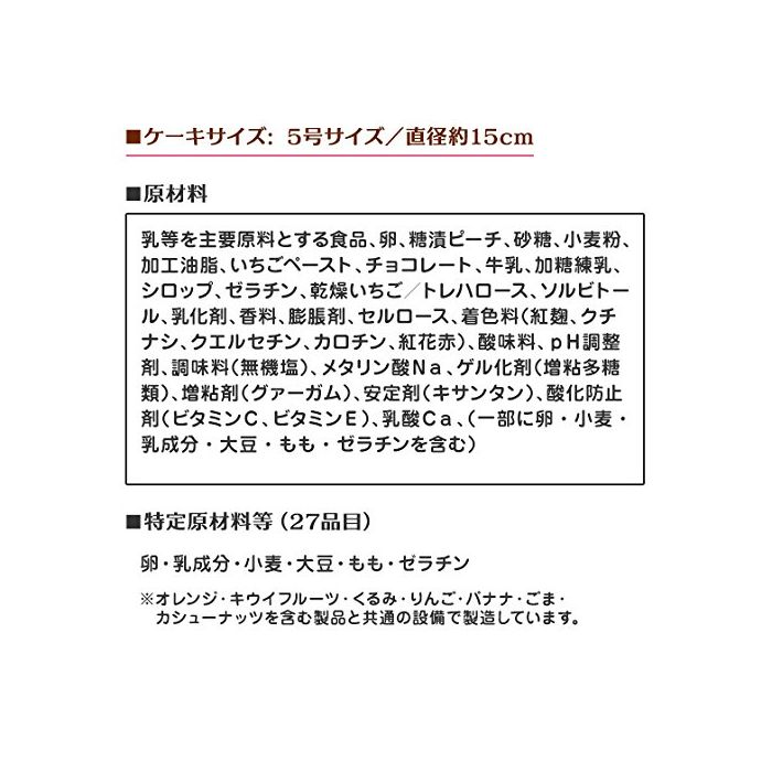 원재료:젖 등을 주요 원료라고 하는 식품,알,당지피치,설탕,소맥분,가공 유지,딸기 Paste,쵸코렛,우유,가당연유,시럽,젤라틴,건조 딸기/트레이닝 헬로《스》,솔《비토루》,유화 제,향료,팽창 제,셀룰로오스,착색료(홍누룩,치자나무,자바리(구에)《루세친》,카로틴,홍화 빨강)고, 신맛료,pH조정 제,조미료(무기염)고, 메타 인산Na,겔화 제(증점다당류)고, 증점제(《구가무》)고, 안정 제(《기산탄》)고, 산화 방지제(비타민C,비타민E)고, 유산Ca,(일부에 난밀 유성분 대두 복숭아 젤라틴을 포함한다)