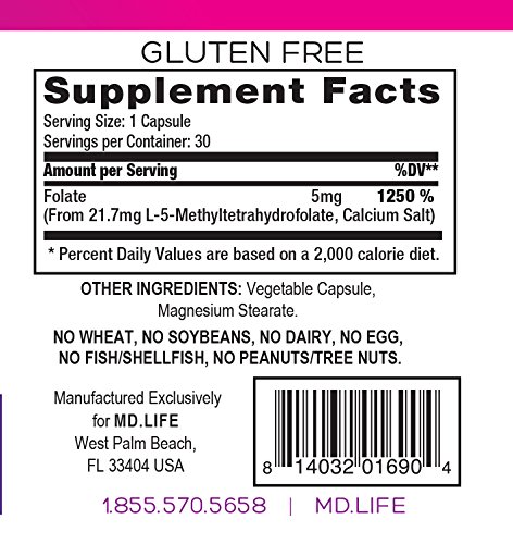 Studio : MD.LIFE Publisher : MD.LIFE Binding : Health and Beauty Product Description Why You Need MD.LIFETM L-Methyl Folate. Did you know that millions of people worldwide have a genetic variation that impairs their ability to properly utilize Folic Acid (also known as Vitamin B9), and they don't even know they have it? MD.LIFETM L-Methyl Folate has the active ingredients needed to help your body absorb important B Vitamins-such as the active ingredient 5-MTHF which is derived from pure L-5-Methyltetrahydrofolate. Inadequate levels of L-5-MTHF have been linked to childhood leukemia, colon cancer, precancerous cervical dysplasia, and breast cancer.* MD.LIFETM L-Methyl Folate contains powerful 5-MTHF which helps play a crucial role in DNA synthesis and repair, ultimately helping to prevent and reduce Folic Acid-related diseases.* MD.LIFETM L-Methyl Folate is a natural health supplement that contains no artificial fillers or preservatives and is Gluten Free, Dairy Free, and Nut Free. Try MD.LIFETM L-Methyl Folate today. 90-Day Satisfaction Guarantee! See Our Awards in the Photo Section! 0