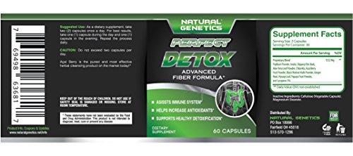 -. Binding : Health and Beauty -. Brand : Natural Genetics -. EAN : 0769498636817 -. Feature : KICK START YOUR CLEANSE: With a full 30 servings per bottle (60 caps), you are set to go for a quick 14 day cleanse or a full month detox. Just take your dose every day and let your body cleanse and repair! / BETTER DIGESTIVE HEALTH: Apart from giving you a boost of clean energy, our daily detox blend helps free the intestinal tract of excess waste and alleviate bloating - with no irritants. Your bowels will be working like a well-oiled machine! / TOTAL CLEANSE! Daily Detox Detoxifies your body and cleanses all your main organs, especially the liver, kidney, colon & lymphatic system. Not only that, it helps regulate your body and keep your immune system running at 100%. / POWERFUL BLEND OF NATURAL INGREDIENTS: We only use the most natural and researched ingredients in our supplements. That's why Daily Detox comes packed with over 10 proven extracts including: slippery elm bark, aloe vera leaf powder, acai berry, black walnut hulls and more. / FEEL THE DIFFERENCE OR GET YOUR MONEY BACK! If you are not 100% satisfied with Daily Detox, you get your money back - no questions asked. We are sure your body will love this supplement and are ready to back up our promise! -. IsAdultProduct : 0 -. Label : Natural Genetics -. Manufacturer : Natural Genetics -. PackageQuantity : 1 -. ProductGroup : Health and Beauty -. ProductTypeName : HEALTH_PERSONAL_CARE -. Publisher : Natural Genetics -. Studio : Natural Genetics -. Title : Best Detox Cleanse for Weight Loss, Immune System, & Balanced Health. PERFECT DETOX Advanced Fiber All Natural Supplement. Psyllium , Acai Berry, Chlorella, Ginger Root & more! Powerful Formula -. UPC : 769498636817