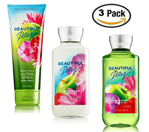 -. Feature : Beautiful Day Bath and Body Works Gift Set - from the best selling signature collection / Beautiful Day is a fragrance as beautiful as the perfect sP.R.Ing day with sun-kissed apple, wild daisies & fresh pink peonies. / You receive THREE (3) items in all - one Ultra Shea Triple Moisture Cream (8 oz), one Body Lotion (8 oz) and one Shower Gel (10 oz) -- $38 Retail Value! / Wash your way to softer, cleaner skin with a rich, bubbly lather bursting and follow up with America's #1 body lotion -fortified with nutrient-rich ingredients like protective Vitamin E and conditioning Vitamin B5, our fast-absorbing, non-greasy formula delivers 16 hours of continuous moisture. / At night, use the Ultra Shea Triple Moisture Cream with soothing Aloe Butter, pampering Cocoa Butter and more Shea than ever before -- this non-greasy formula melts into skin to provide beautiful fragrance and all day, all night hydration.