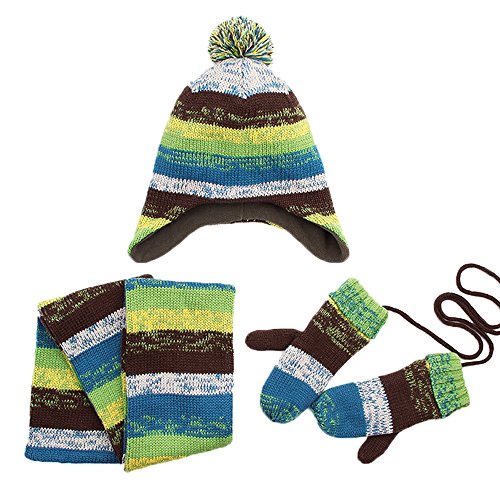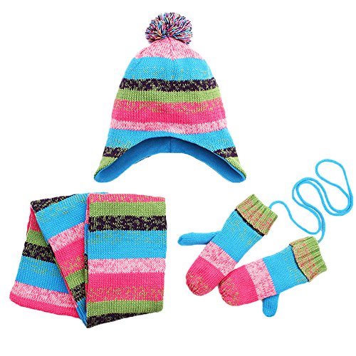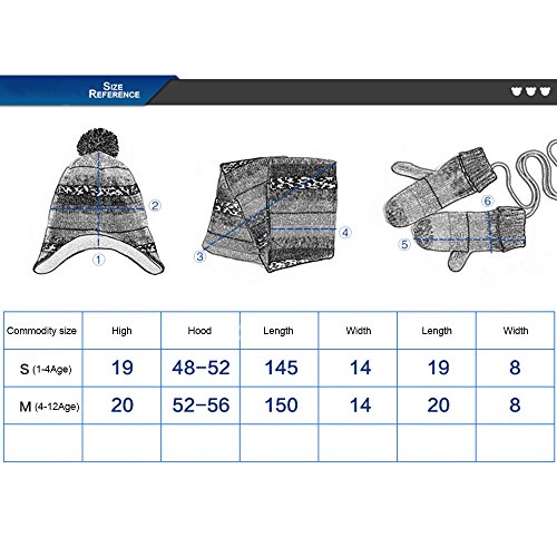 High-quality knitting yarn, let your baby feel comfortable. Great gift idea for friends, family, and your little boys and girls This matching hat scarf and gloves set makes a wonderful gift set. Each set comes with 1 Pompom beanie, 1 pair of mittens, 1 scarf Makes the perfect gift for Thanksgiving, Christmas, New Year or any occasion Excellent all-inclusive fall/winter accessory set to keep you warm during the cold days 3-piece set includes cable knit fleece lined beanie hat with a matching scarf and gloves Lovely 3 piece matching set in multiple solid colors to match any of your Children's winter outfits [ Size Chart (Inch) For Denim Blue] S Recommend 1-4(years): Hat 48"-52" Diameter x 19" H, Scarf 145" L x 14" W, Gloves 19" L x 8" W M Recommend 4-12(years): Hat 52"-56" Diameter x 20" H, Scarf 150" L x 14" W, Gloves 20" L x 8" W [ Size Chart (Inch) For Rose Red] S Recommend 1-4(years): Hat 48"-52" Diameter x 19" H, Scarf 145" L x 14" W, Gloves 19" L x 8" W M Recommend 4-12(years): Hat 52"-56" Diameter x 20" H, Scarf 150" L x 14" W, Gloves 20" L x 8" W [Package Included] 1 x Pompom beanie 1 x Pair of mittens 1 x Scarf [Note] Size mearsured by ourselves,sometimes has some errors,but always within 3cm (All measurement in cm and please note 1cm=0.39inch). Due to some reason,there are some color difference,please kindly understand us,thank you and wish you happy shopping!