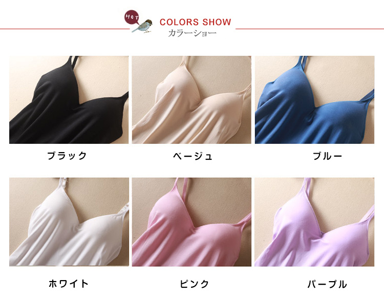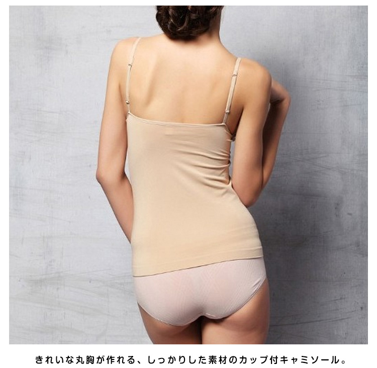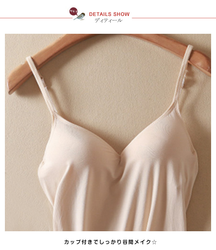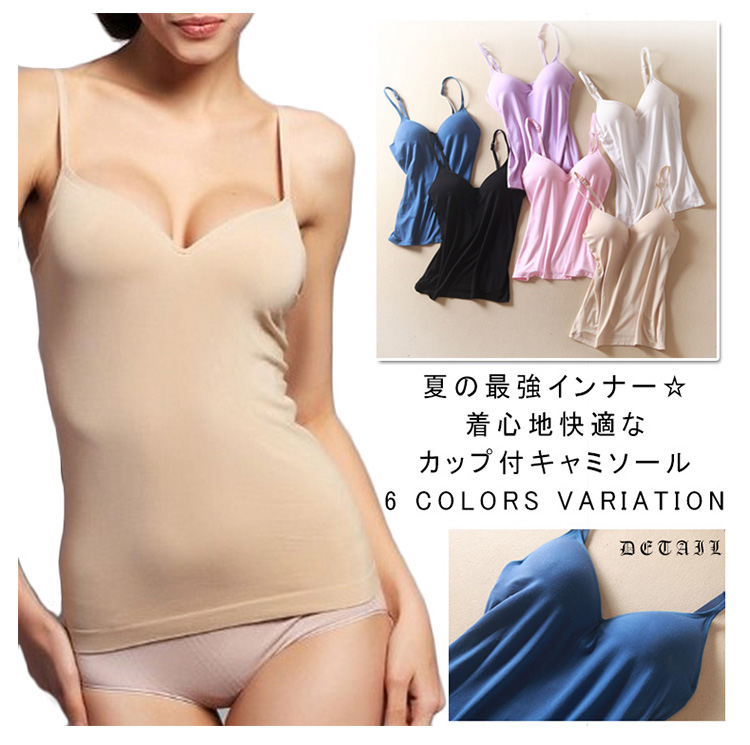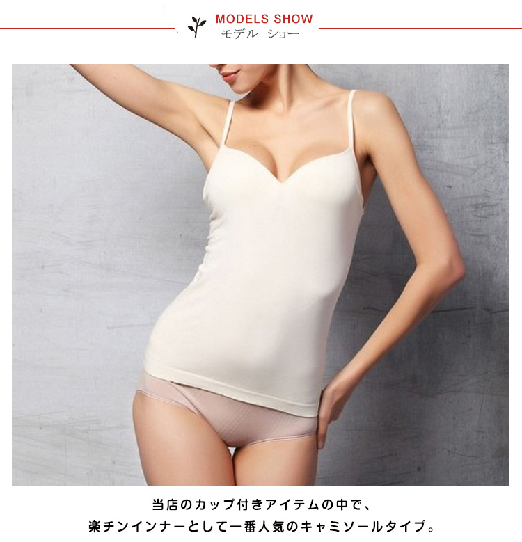 | 夏の最強インナー☆着心地快適なカップ付キャミソール。当店のカップ付きアイテムの中で、楽チンインナーとして一番人気のキャミソールタイプ。きれいな丸胸が作れる、しっかりした素材のカップ付キャミソール。アンダー部分はゴムが1周し、内側布が全体を支える構造。動いてもカップがずれにくくなっています。オールシーズン必須ITEM!! | |