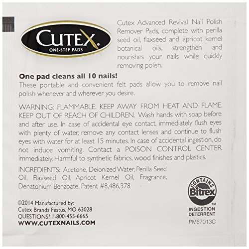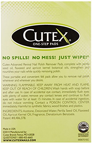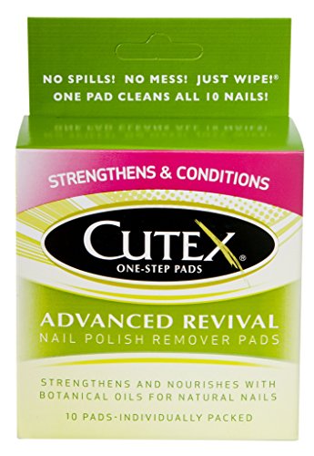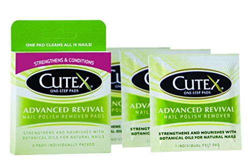 ReleaseDate : 2016-09-06 Studio : Revlon Consumer Products Corp. - Mitchum Publisher : Revlon Consumer Products Corp. - Mitchum Binding : Health and Beauty Product Description Cutex Nail Polish Remover Pads offer a handy way to quickly remove polish and condition nails and cuticles in one easy step. Our patented formula is specially designed to remove polish faster than any other brand, and features an exclusive combination of ingredients that will help strengthen and nourish your nails while moisturizing and softening your cuticles at the same time. Since Cutex pads are bigger and thicker than ordinary pads, they make polish removal a snap-whether you're at home or on the go. Each felt pad is saturated with your choice of the best non-acetone nail polish remover or acetone nail polish remover available. A single pad removes polish from ten nails, fingers or toes-even dark and hard-to-remove colors. Cutex Nail Polish Remover Pads are available in boxes of ten or three individually wrapped pads. They're perfect for travel, too. Get them in regular formula for natural nails or non-acetone formula for both natural and artificial nails. Also available in advanced formula, which combines botanical oils with Cutex's patented remover formula that strengthens and nourishes nails after just one use. 0