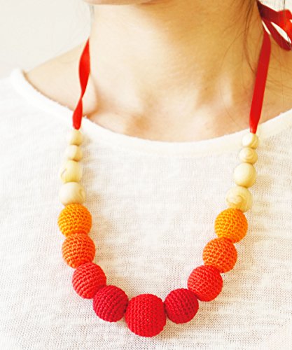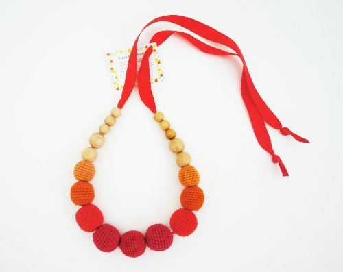 赤ちゃんが握っても舐めても安心な天然素材でできています。赤ちゃんが舐めたり、ママが着用時に汗をかいても手洗いができるネックレスです。サテンリボンで長さが調節できるため、赤ちゃんの握りやすい位置でネックレスを着用できます。サテンリボンからビーズがとれないように先端にノットビーズを入れております。普段のママファッションにプラスしてもテンションがあがるカラーとデザインとなっております。