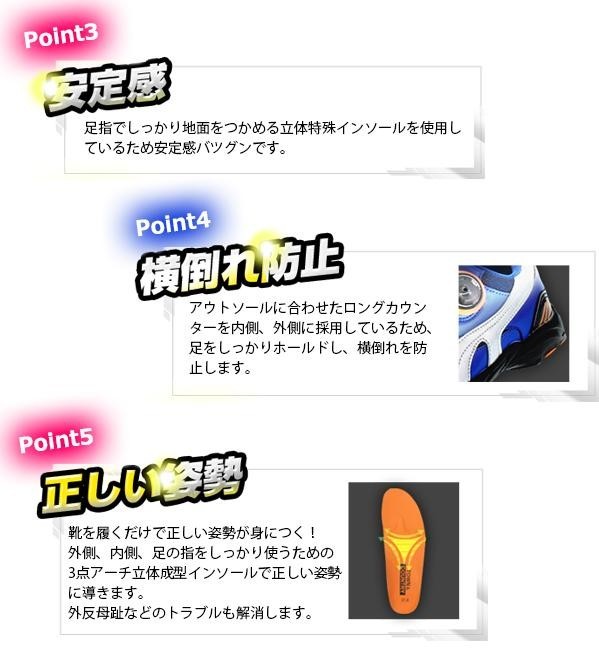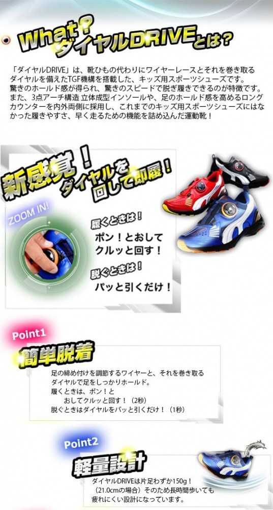 | 「ダイヤルDRIVE」は、靴ひもの代わりにワイヤーレースとそれを巻き取るダイヤルを備えたTGF機構を搭載した、キッズ用スポーツシューズです。驚きのホールド感が得られ、驚きのスピードで脱ぎ履きできるのが特徴です。また、3点アーチ構造立体成型インソールや、足のホールド感を高めるロングカウンターを内外両側に採用し、これまでのキッズ用スポーツシューズにはなかった履きやすさ、早く走るための機能を詰め込んだ運動靴!! |