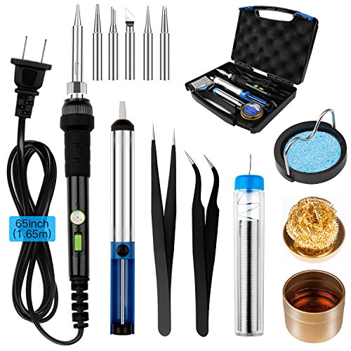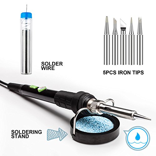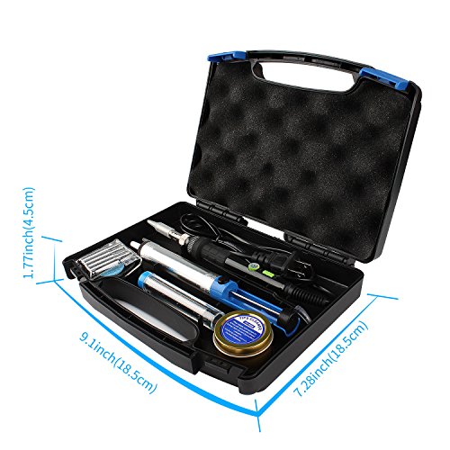 【8-in-1 Sodering Iron Kit 】 - Come with Adjustable Temperature Electronic Soldering Iron + Solder Sucker + Tin Wire Tube + 5pcs sodering tips + Soldering Stand + Tip Cleaner(Copper wires and rosin) + Angled and Straight Tweezer + Tool Carrying Case.