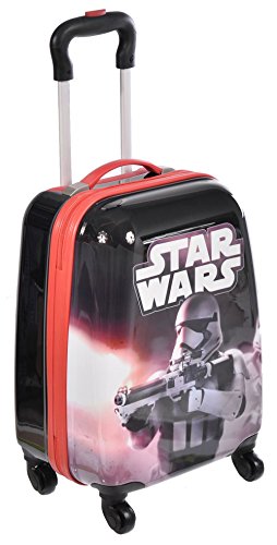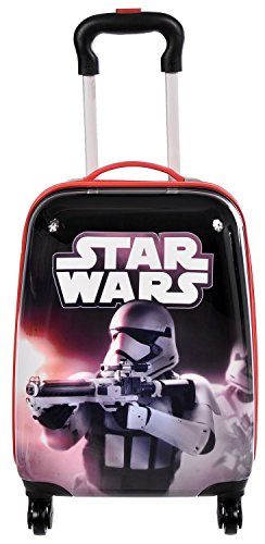 Star Wars spinner trolley with retractable handle and spacious interior. Star Wars Spinner Trolley Exclusive Designed Kids Hard Side Luggage Case 18 Inch is now available with nice combination of Black and Red color, featuring popular prints of Star Wars. This 18" luggage allows for more packing space than our traditional kids luggage. Its four spinner wheels spread the weight evenly while allowing for smooth and effortless motion in different terrains. It's others features are Includes an easy-to-use retractable handle, Two separate spacious interior compartments, 4 wheels for optimal maneuverability, Latest Star Wars artwork featuring Storm Trooper and Perfect for the kid on the move. Features: - Brand: Star Wars