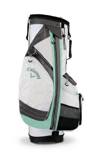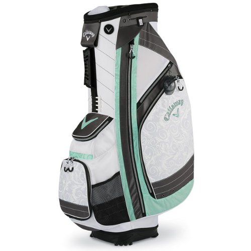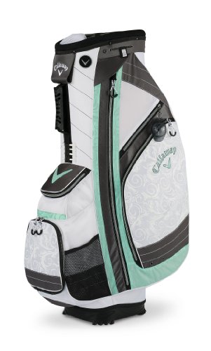 With ten pockets, including a velour-lined valuables pocket and a mesh water bottle pocket, the Callaway Women's Solaire Cart Bag offers plenty of specialized storage options for all your on-course essentials. All zip pockets face forward for easy access while on the cart, making accessing your gear quick and easy. Features: 10", 14-way top with four full-length dividers ACS – Anti-Crush System internal frame External putter tube Umbrella cord Rain hood and elastic towel cord Ball-alignment zipper pull and pen holderFeature