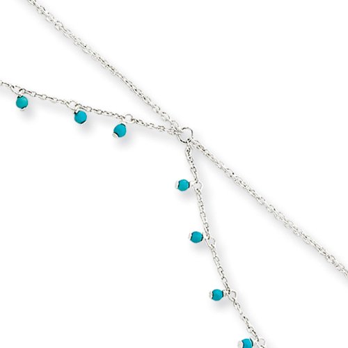 Accessorize your ankles with a feminine bracelet that combines color and movement with each step you take. Accenting the 10-inch, double strand, sterling silver 1mm cable chains are 2mm dangling impregnated turquoise beads. A spring ring clasp keeps this beautiful anklet securely fastened. The color range varies on all natural stones so please allow for slight variations in shades.Feature