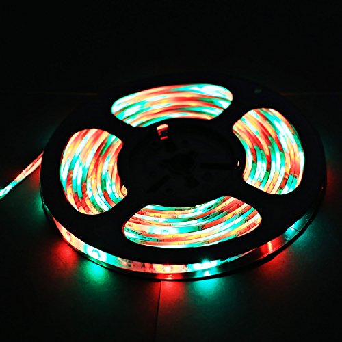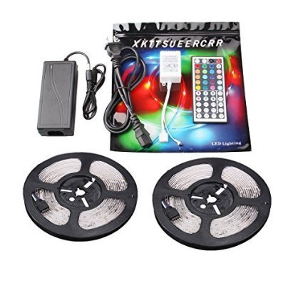 XKTTSUEERCRR (Two Rolls) 3528 SMD 270LED, 10M/32.8 FT, Waterproof Flexible RGB Color Changing LED Light Strip For Outdoors/Indoors/Car/Stage/Festivals/Party Decoration + Multifunction 44Key IR Remote Controller + 12V 5A Power Supply. Specifications: *Color: RGB. *LED Type: 3528 SMD, 270LED/5M. *Size: 196.85x0.40x0.10(inch). *Protection Grade: IP65(Waterproof). *Long life span: 50,000+ hours. *Working Current/meter: 0.4A/M. *Output power: 4.8W /M. *Luminous Flux: 270-300 Lumens/M. *Working Tempreture:-20 to 50 degree. *Drive Mode: Contant Voltage,12V DC. Applications: 1.For automobile and bicycle decoration, border or contour lighting; 2.For home and office decoration, hotels, clubs, shopping malls, holiday, party, etc; 3.For architectural lighting, boutique atmosphere lighting, back lighting, concealed lighting, emergency & security lighting, advertisement sign lighting. 44Key Remote Controller: 1. For 5 meters RGB LED light strip, allowing you to adjust brightness, customize light color, set fade in/out and flash rate. 2. 16 colors,6 DIY keys,8 light pattern: Quick / Slow / Auto / Flash / 7 color fade change / 3 color fade change / 7 color jumpy change/ 3 color jumpy change/ R、G、B increase and decrease control. 3. Other tri-color, common anode LEDs may be used if configured to work with 12V DC supply voltage by means of voltage dropping resistors. 4. IR remote controller uses a CR2025 battery and requires a 12V DC power supply. Package included: 2 x 5M 3528 SMD 270LED RGB Waterproof Strip Light. 1 x 44Key Remote Controller. 1 x 12V 5A Power SupplyFeature