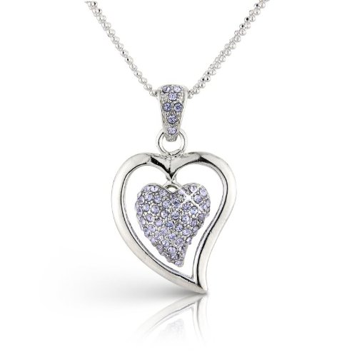 Amethyst Purple Heart Set, By Crystal Elegance UK. An elegant design double heart necklace pendant with amethyst purple crystals. Pretty heart earrings measure 1cm by 0.8cm with a total drop down length including hoop of 2cm approx. The chain measures 40cm-45cm (adjustable). This is the perfect gift for her for any occasion. Elegant item for her.Feature