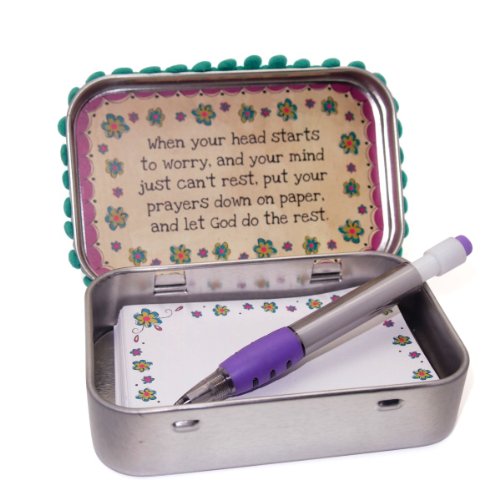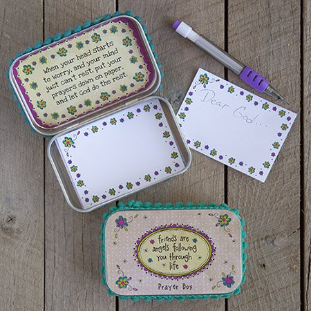 -. Binding : Kitchen -. Brand : Natural Life -. EAN : 0614390324754 -. Feature : 'Friends Are Angels Following You Through Life' Prayer Box; Includes Tin box, owl motif paper and pen / Inspirational message: "When your head starts to worry, and your mind just can't get rest, put your prayers down on paper, and let God do the rest." / Box - approx. 3 3/4"L x 2 3/8"W x 7/8"H / Pen - approx. 3 7/8"L / Great gift! -. Label : Natural Life -. Manufacturer : Natural Life -. Model : A-NL PBX 11 -. MPN : A-NL PBX 11 -. PackageQuantity : 1 -. PartNumber : A-NL PBX 11 -. ProductGroup : Home -. ProductTypeName : HOME -. Publisher : Natural Life -. Size : 3 3/4" L x 2 3/8" W x 7/8" D -. Studio : Natural Life -. Title : Natural Life Frienship and Angels Inspirational "Friends are angels following you through life" Memory Prayer Box with Pen and Notecards -. UPC : 614390324754