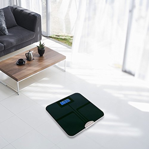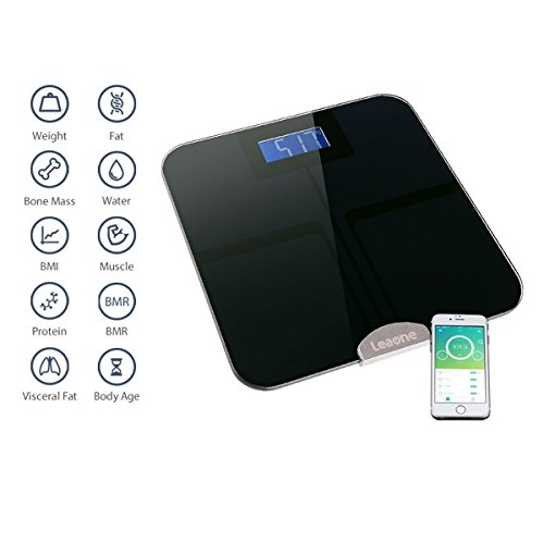 -. Feature : APP monitor--The Leaone APP monitor health change at any time,which can record your weight change.(Support IOS&Android)With the ITO layer,the scale can get your body data,such as BMI,water(%),muscle(%),bone(%) ITO layer provides a metal-less surface and higher sensitivity Accommodate up to 8 Family Members and Keep Data / Respectively: This BMI scale APP tracks and records every measurement for you, creates tables, lists, and graph display options / CLEAR RESULTS--Vivid blue backlight display for clear readability in any light setting with Auto on/off,Low battery and overload indication / Power Saving-- High-performance world class chips,which is low power consumption,fast caculation and weighing accurately. Included with 4pcs of 3 AAA battery / WARRANTY:100% CE Satisfaction Guarantee for 1 year and refund without question in 15 days