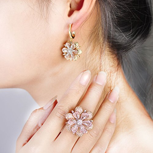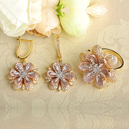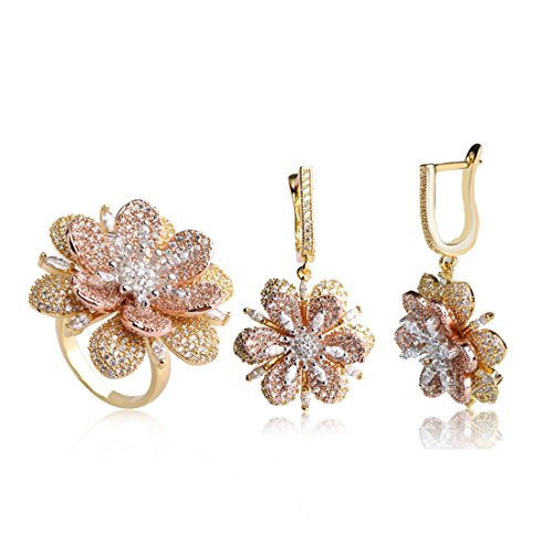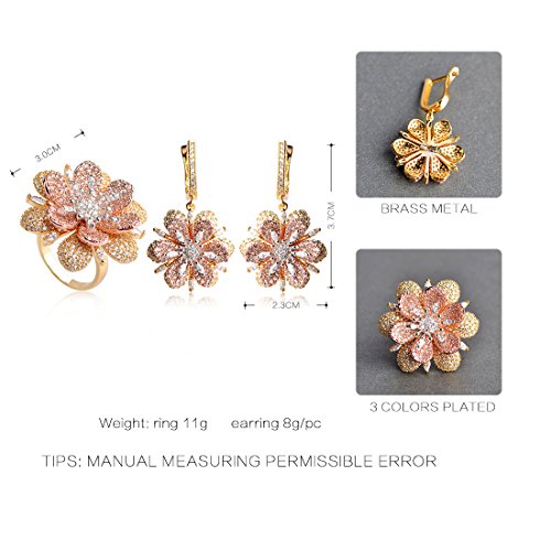 QUALITY GUARANTEEThis jewelry sets include 1 pairs of earrings, and 1 ring. It is made with brass metal(cooper metal). The little shiny stones are cubic zirconia, all full inlay. The craft is very exquisite and difficult.