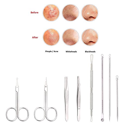 - 8-in-1 MULTIFUNCTIONAL: 8-piece pimple extractor tools are surgical grade and perfect for popping pimples, pinching zits, squeezing whitehead, removing acne and blackheads.