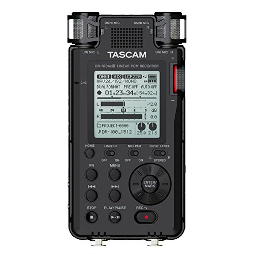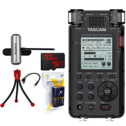 Tascam 192kHz/24bit-Compatible Studio-Quality Linear PCM Recorder (DR-100MKIII) w/Bundle + 32GB Micro SD Card + AA Charger w/4 2950mah AA Batteries + Flexible Mini Table-top Tripod +Tascam AC Adapter