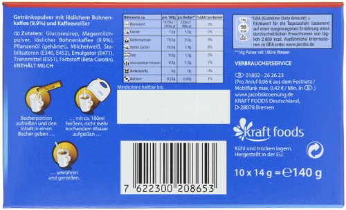 -. Feature : Feinster Kaffeegenuss, praktisch & jederzeit. / für alle, die weißen Kaffee am liebsten haben, wenn er nicht süß ist / 10 praktische Becher-Portionen / Nettogewicht gesamt: 1680 g