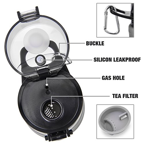 【LEAK PROOF】 Yoga water bottle has leak-proof guarantee with 3 parts: 1, the lid is with lock equipment on the open button, the equipment can flip up and down, when up, it is locked, when down, it is unlocked; 2, there is a silicon design to block the gas hole to prevent the liquid from flowing out; 3, there is a big silicon design to block the drinking mouth to prevent the liquid from flowing out.
