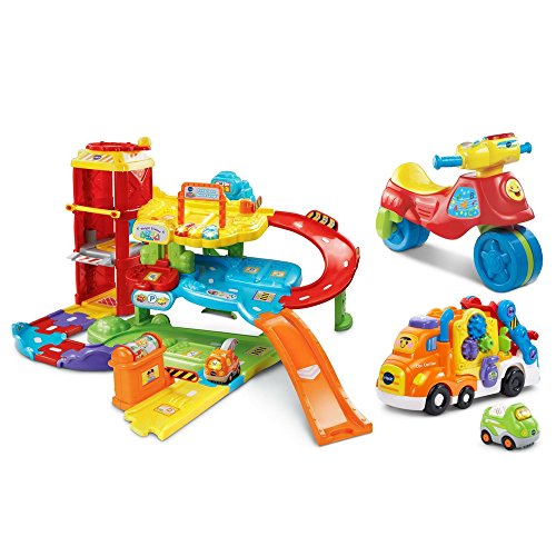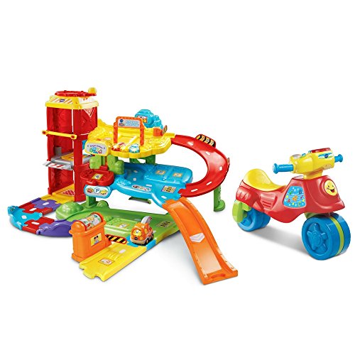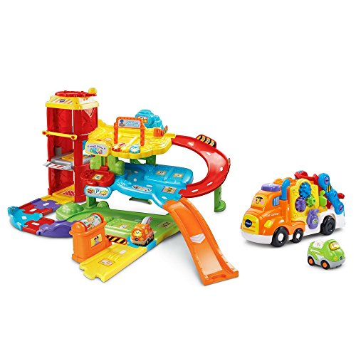 Playtime with miles of learning! Park, play and explore on three stories of interactive learning fun with Tommy and his tow truck at the Go! Go! Smart Wheels Park and Learn Deluxe Garage by VTech. Learn about colors, the rules of the road and play fun sing-along songs and melodies by pressing the three light-up buttons. Roll the SmartPoint tow truck over nine SmartPoint locations to hear different phrases, music or fun sound effects. Press the toy tow truck’s light-up button to hear three sing-along songs and learn the letter T and the name of the vehicle. Build motor skills by placing the tow truck in the elevator and turning the helicopter pad to raise the elevator to any floor on the toy garage. The elevator recognizes each floor with fun sounds and phrases. Use the seven included track pieces to connect to other Go! Go! Smart Wheels and Go! Go! Smart Animals playsets (each sold separately) to encourage creativity. Features durable design, automatic shut-off and volume control. Playset requires 2 AA batteries (not included). Tow Truck requires 2 AAA batteries (batteries included for demo purposes only; new batteries recommended for regular use). Assembly required. Intended for ages 1 to 5 years.Feature