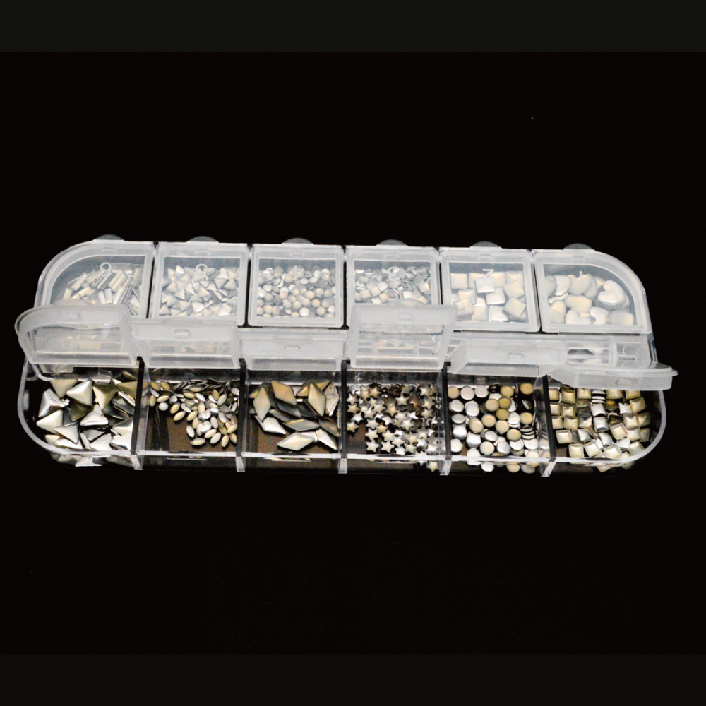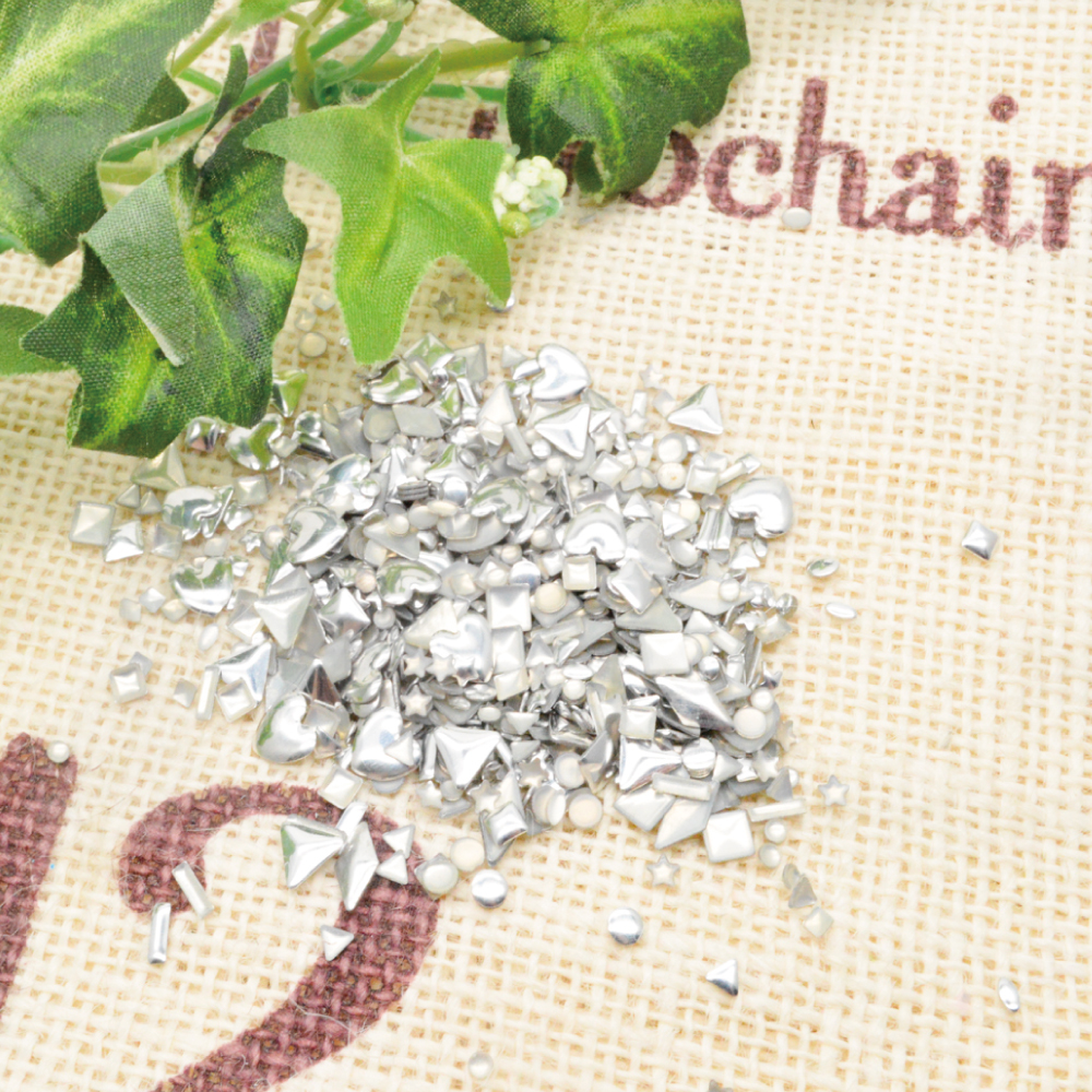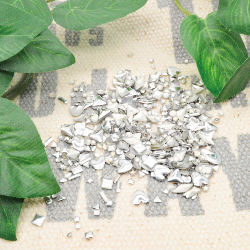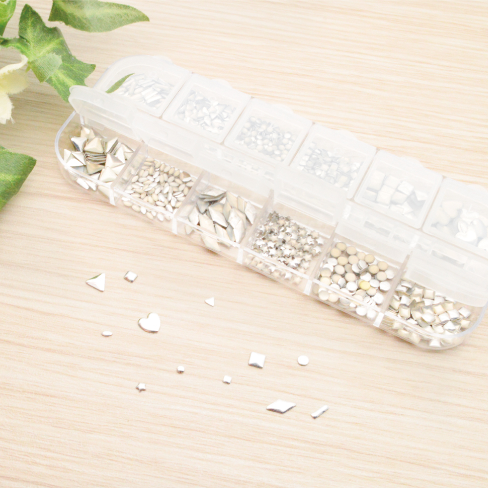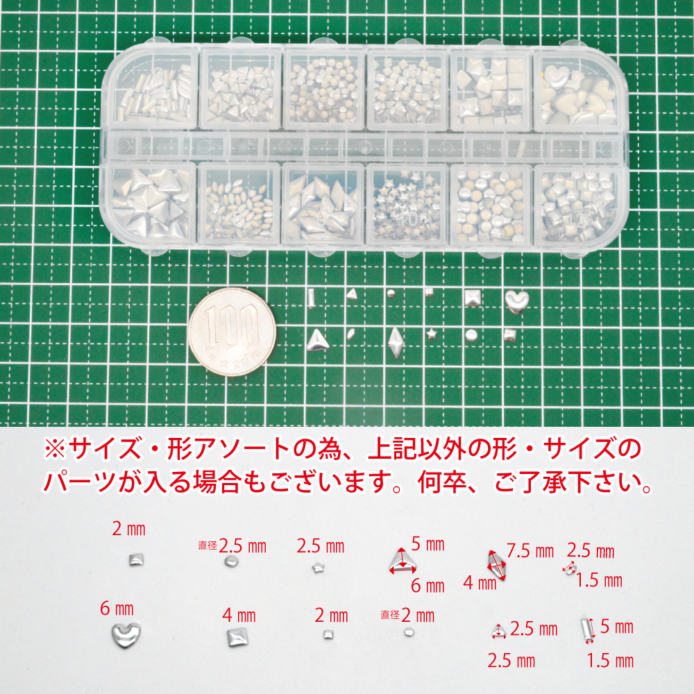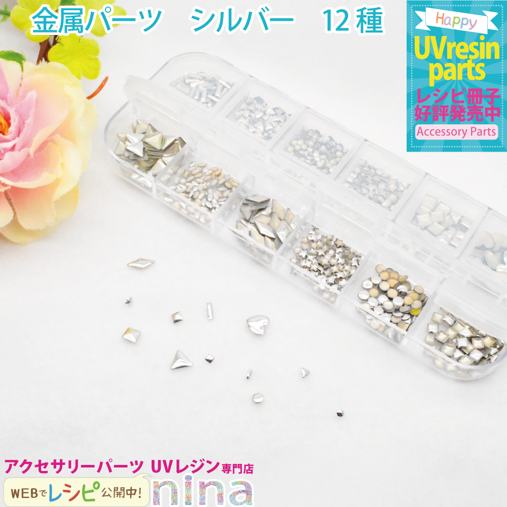 ■商品説明:12種類のシルバーとブラックパーツです。三角やハートなど幅広いデザインのアクセサリー作りが楽しめます!レジンアクセサリーやネイルにも大活躍です♪