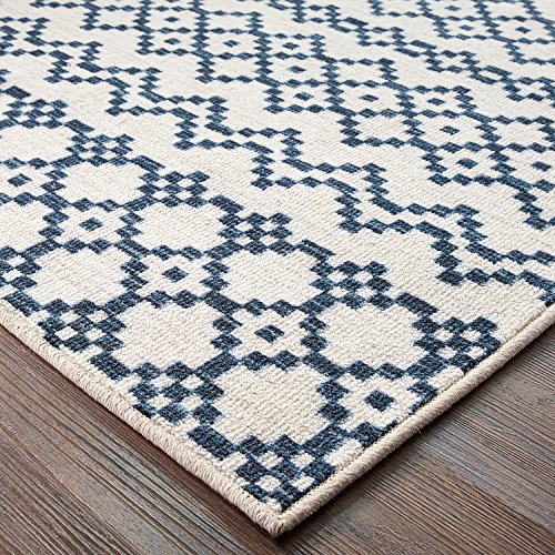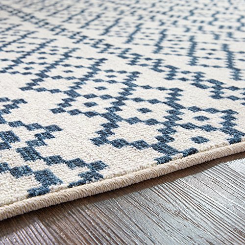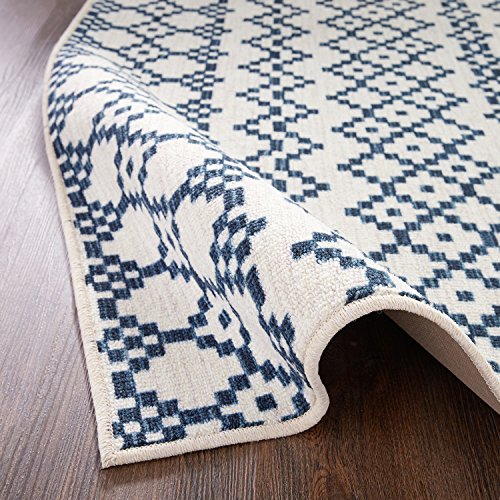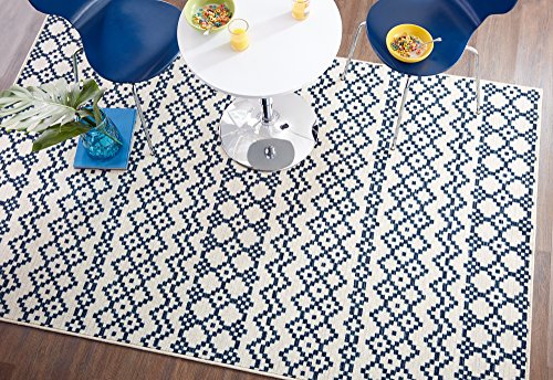 Lines of Aztec inspired artwork run parallel along this show stopper from Mohawk Home. Set in a stunningly smart palette of indigo and tan, this one provides versatile design without a hint of boredom! This rug is constructed of 100% Mohawk Exclusive Wear-Dated Nylon, a premium fiber that promises proven wear-free performance, and is reinforced by our durable latex backing for a quality you can trust. Available in denim. Printed on the same machines that manufacture one of the world’s leading brands of printed carpet, this rug is extremely durable and vibrant. This technology allows the use of multiple colors to create a rug that is wonderfully designed and applicable to any room in your home. With this gorgeous transitional style and geometric pattern, this rug's pile height is 10/32 in high. Remember to keep the pile and fabrics in tip top shape. Area rugs should be spot cleaned with a solution of mild detergent and water or cleaned professionally. Regular vacuuming helps rugs remain attractive and serviceable. Only the best quality materials will do. This rug is printed with a level loop pile on Wear Dated 100% nylon, backed with latex. Made in USA.Feature