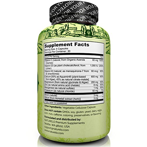 -. Title : NATURELO Bone Strength - with Plant Calcium, Magnesium, Vitamins C, D3, & K2 - Best Whole-Food Supplement for Bone Health - 120 Vegetarian Capsules
