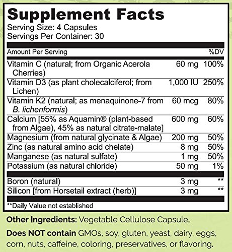 -. Feature : 100% NATURAL: Features Raw Calcium from Algae, Vitamin C from Organic Acerola Cherries, Plant-Sourced Vitamin D3 from Lichen. / BETTER ABSORPTION: Includes Nine Critical Co-Factors that Enhance Calcium Absorption - Magnesium, Zinc, Manganese, Potassium, Boron, Silicon, as well as, Vitamins C, D, & K. / COMPLETE FORMULA: Provides 600 mg of Elemental Calcium from Two Different Sources, 200 mg of Natural Magnesium Glycinate, 1000 IU of Vitamin D3, and 7 Other Important Vitamins & Minerals. / POWERFUL BENEFITS: Reduces the Risk of Osteoporosis in Men & Women Over 40 - Promotes Bone Density - Supports Joint Health - Restores Wellness - Makes a Perfect Prenatal Supplement for a Healthy Pregnancy.* / PURE: Does NOT Contain GMOs, Soy, Gluten, Yeast, Dairy, Eggs, Corn, Nuts, Caffeine, Coloring, Preservatives, or Flavoring. Free of Animal By-Products. ApproP.R.Iate for Vegans and Vegetarians.