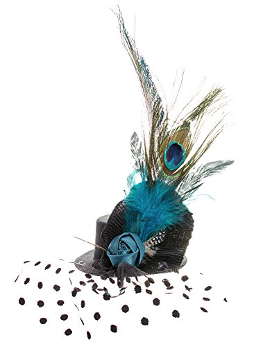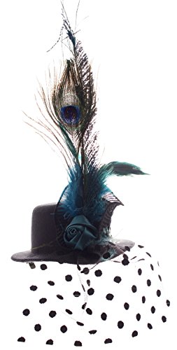 -. Binding : Apparel -. Brand : Linda Ann's Variete -. Color : Green -. Department : womens -. Feature : Black felt tiny mini hat 4" brim 1" tall / Chiffon black ribbon behind the feathers / Polka dot tulle 5" veil, 1" silk rolled rose bud, / Peacock & fern feather + other assorted feathers / one large hair clip -. Label : Linda Ann's -. Manufacturer : Linda Ann's -. ProductGroup : Apparel -. ProductTypeName : ACCESSORY -. Publisher : Linda Ann's -. Size : One Size -. Studio : Linda Ann's -. Title : Linda Ann's Peacock Feathers, Rose Bud, Mini Top Hat 4" Hair Clip