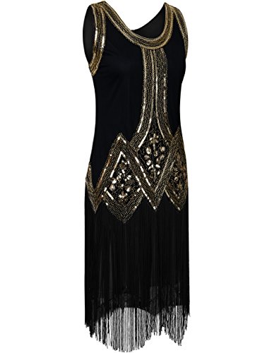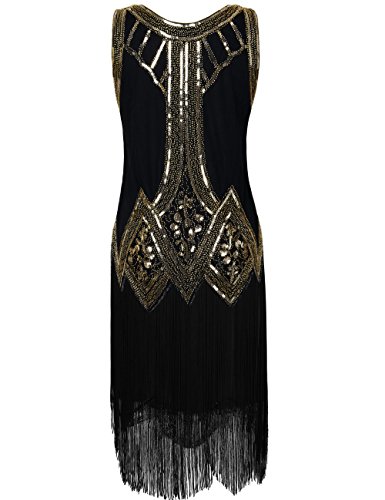 This black dress is another respect of the 1920s ,low-key , elegant ,but not ordinary at all.Embellished with large quantity of metal beads,several sequins,and black tassel which interspersed with gold line,express the visual beauty.This dress mixed with modern and vintage, originality and inspiration, passion and sagaciousness.Its modern stylish twist and true inspiration to the Vintage Sensation inspired everyone.Feature
