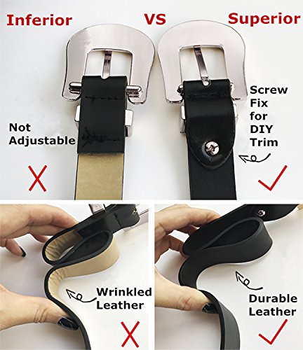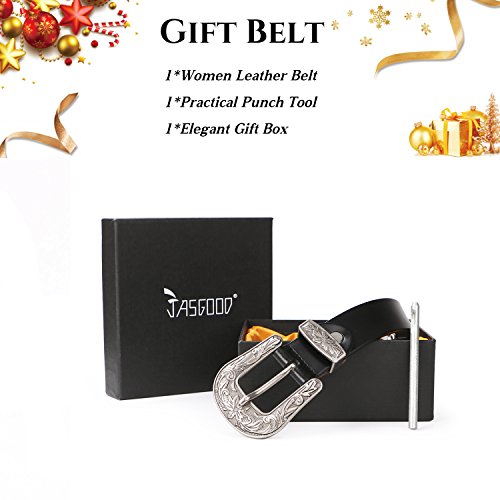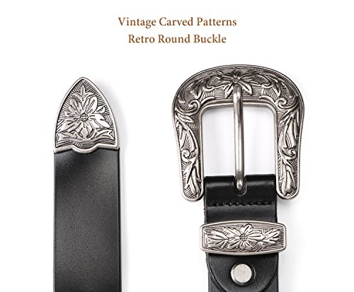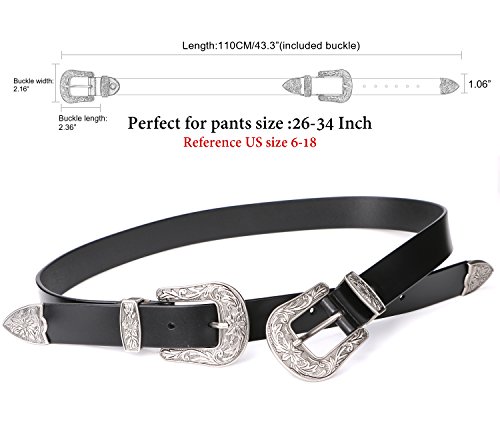 Ladies western leather belt for women Features: 1.Belt size with floral-embossed buckle:110cm belt size 31"-34" perfect for 28"-31"waist (US size: 8-14), Width: 27mm (1.06inch). 2.Material:Black/Brown/Coffee colors could fit vintage leather women belts for jeans. 3.Unique and fashion antique design with good quality, quite Comfortable and Durable to wear. 4.Awesome casual accessory for indoor and outdoor activities.
