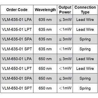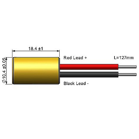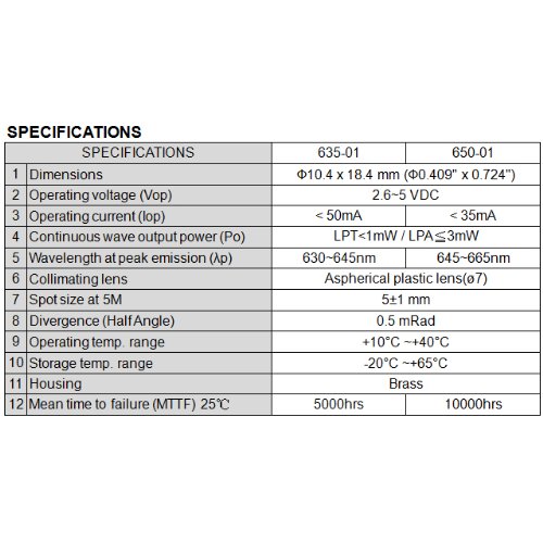 Wavelength: 650nm. Output power: Class IIIa - less than 5mW. 2.6~5 VDC operation. Dimensions: D10.4 x 18.4 mm.