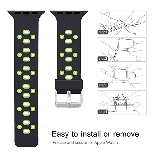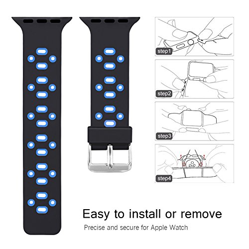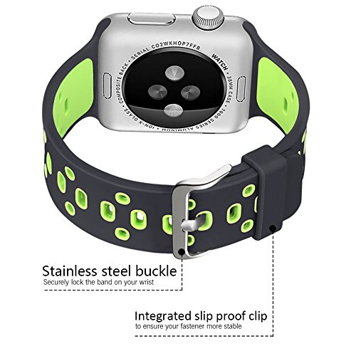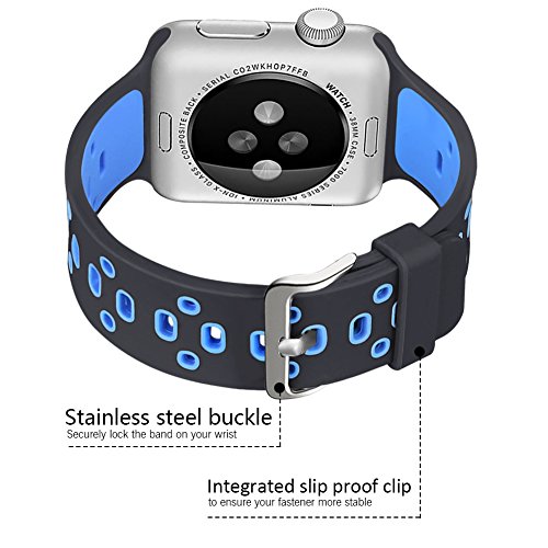 -. Feature : Applicable Type and Size: This silicone sport replacement band is fit for Apple Watch +, Series 2, Series 1, Series 3, Sport Edition. It has 2 versions, 38mm and 42 mm. Make sure you choose the right version. And band for 38mm watch is shorter than 42mm's. 38mm fits 5.7-7.87 inches (140mm-200mm) wrist.42mm fits 6.5-9.0 inches (165mm-230mm) wrist. / Best choice for working out and outdoor jobs! This sport band for apple watch is light and breathable because of the holes on it. No more sweat! It is soft, skin-friendly, and comfortable and makes sure your apple watch won't drop when you work out. / Material: The band is made of flexible harmless silicone, which is comfortable and allergy free. The buckle is stainless steel. It won't rust and locks securely. No more worries of the watch falling off. / Package Content: Silicone sport replacement strap for apple watch only. No watch or other accessories. / After-sales Service: 180 days warranty. Hassle-free customer service: if there are any quality problems, just contact us. We would refund you or sent you a brand new one with 180-day warranty. ATTENTION: Our band is waterproof. But please make sure your watch is waterproof. If not, please take it off when showering or swimming.