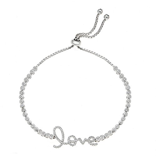 -. Feature : Crafted in 925 Sterling Silver / Rhodium plated for tarnish guard / Adjustable; fits up to 9" wrist. / Curcive open LOVE station with CZ crystal pavé / Shipped in an Elegant Gift Box!