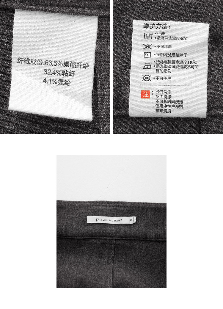 | 洗涤标准: | 不可漂白悬挂晾干不可干洗不可浸泡110℃以下垫布熨烫40℃以下手洗 |
