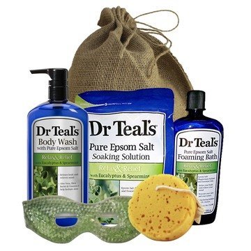 RELAXING SPA GIFT === Dr Teal's 5 Piece Relax and Relief with Eucalyptus Spearmint Bath Set Featuring Pure Epsom Salt Soaking Solution, Pure Epsom Salt Foaming Bath, Ultra Moisturizing Body wash, Natural Sponge, and Gel Bead Eye Mask in a burlap gift bag