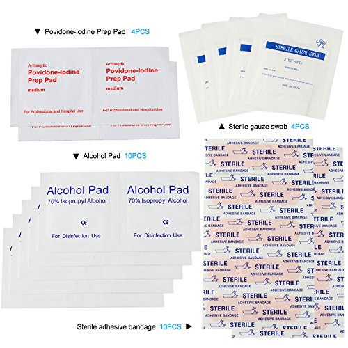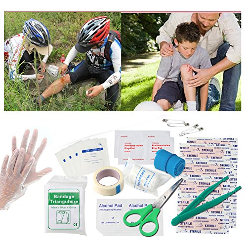 Small Size: 20cm X 13cm. Each bag including: Bandage, PBT Bandage, Alcohol Pad, Povidone-lodine Prep Pad, sterile gauze swab, sterile adhesive bandage, tweezers, safe pin, scissors